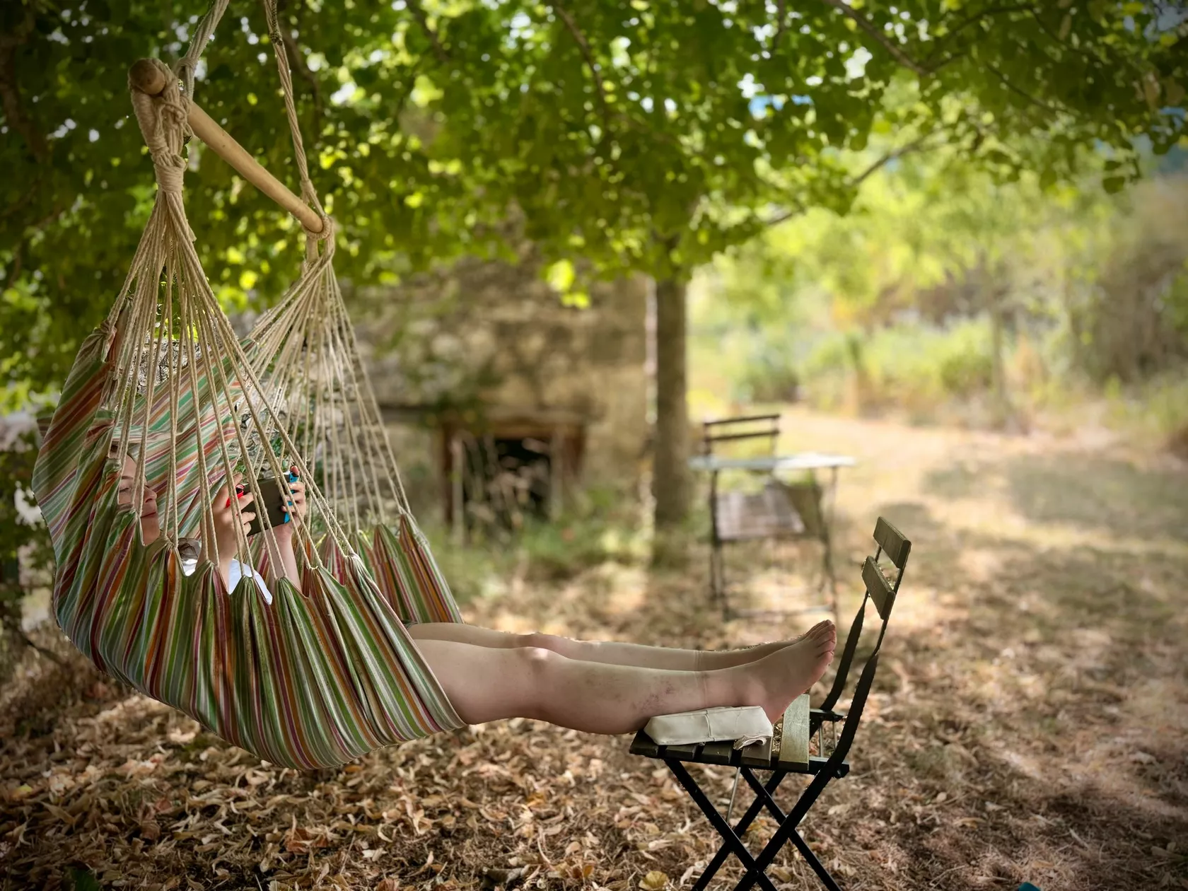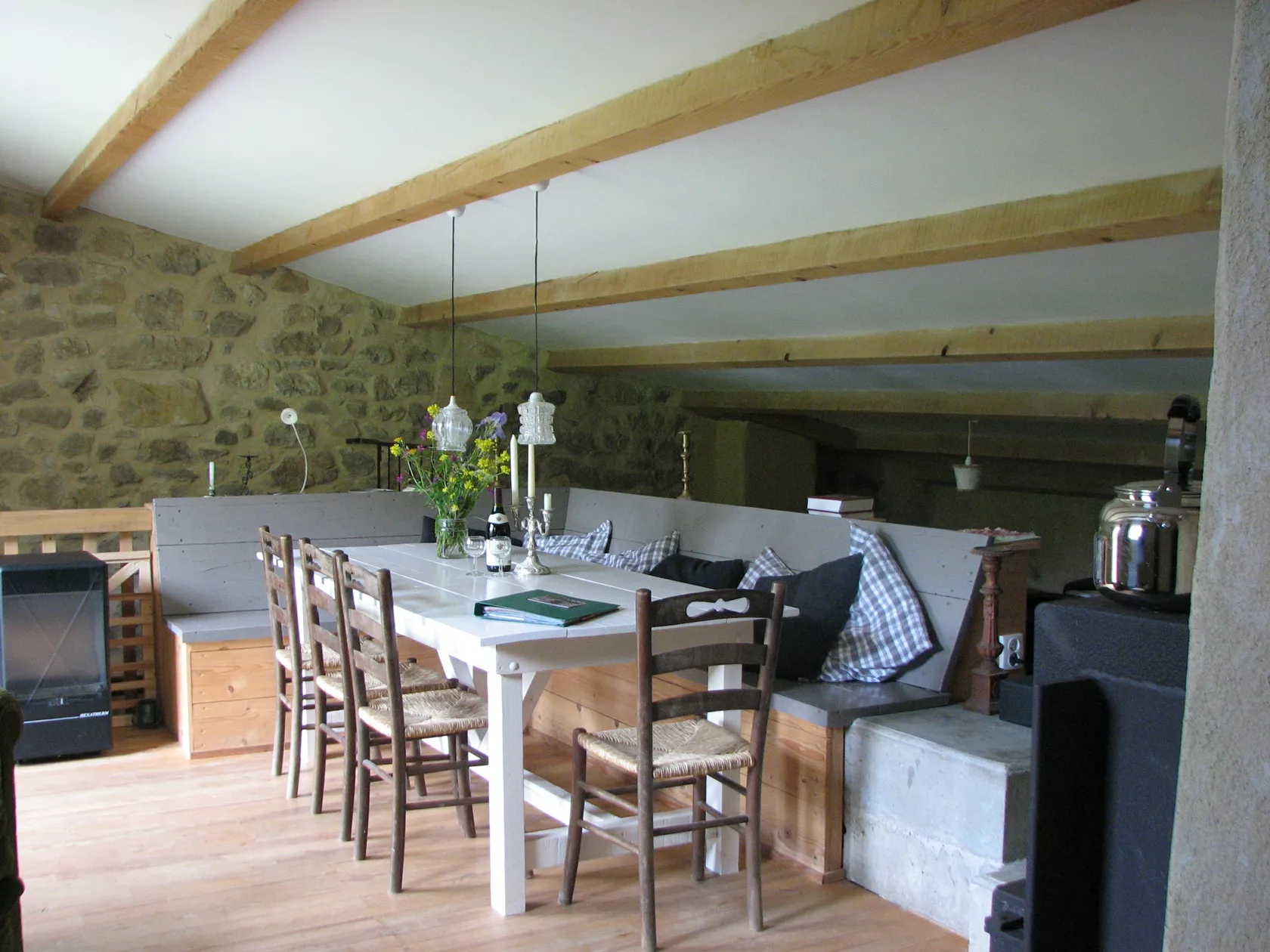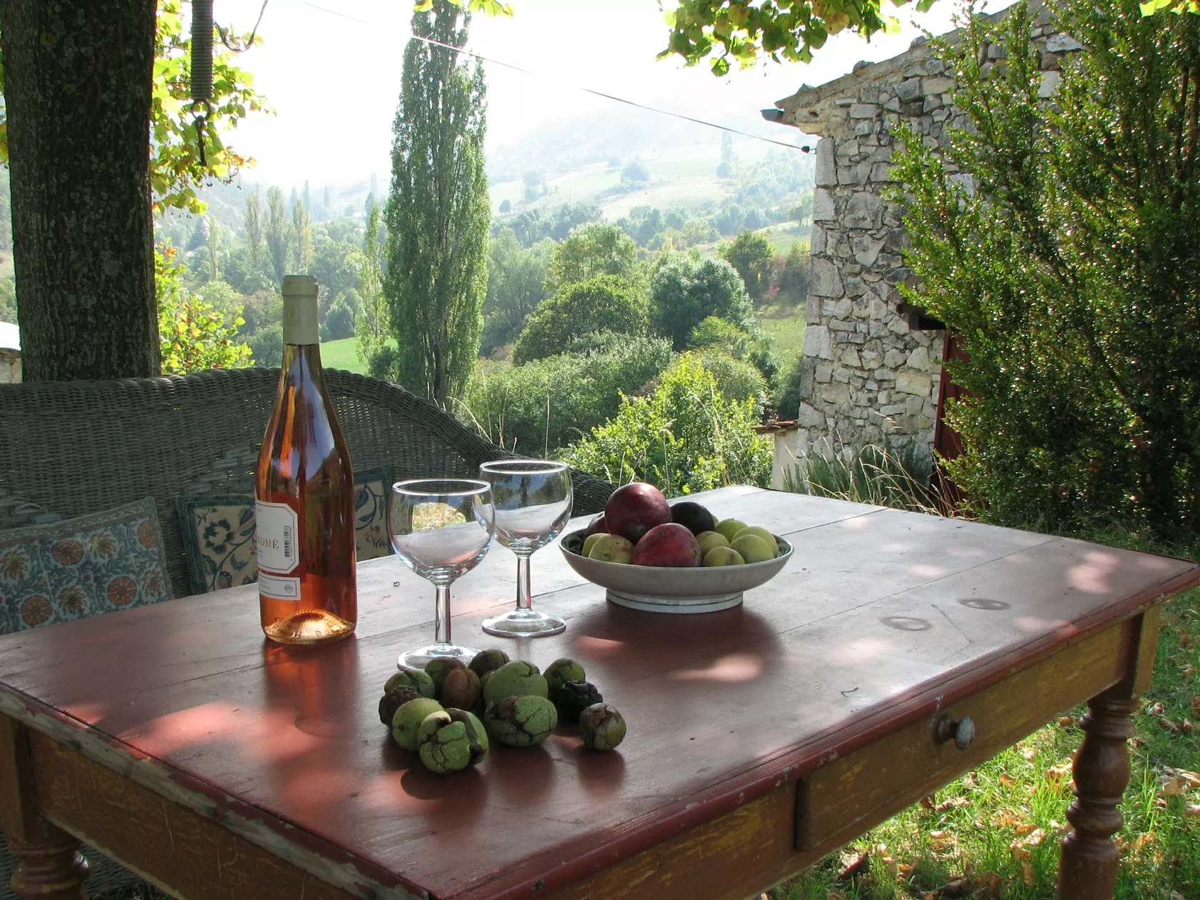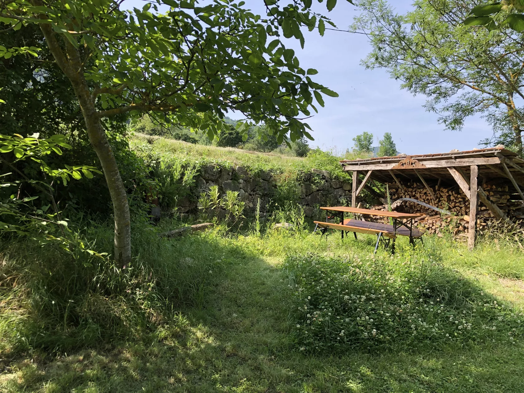 De openslaande deuren van de eetkamer komen uit op het terras en de tuin aan de achterkant van het huis. Er zijn verschillende plekken om buiten te zitten, op het terras bij het huis, onder de lindeboom in de schaduw of in het gras. Op alle plaatsen heeft u een weids uitzicht over de vallei en op de bergen.