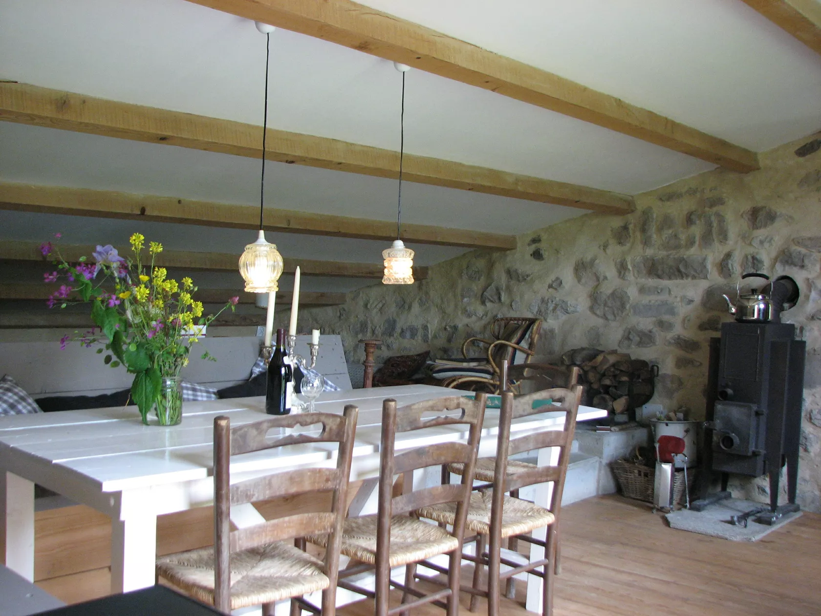 Er zijn drie slaapkamers, een keuken met grote koel/vrieskast, 5-pits gasstel en oven, een eet-/woonkamer met houtkachel. Van de twee badkamers heeft er één een bad, douche, wastafel en wc, en de ander badkamer bevindt zich in de twee persoonskamer en bestaat uit een douche en wc..