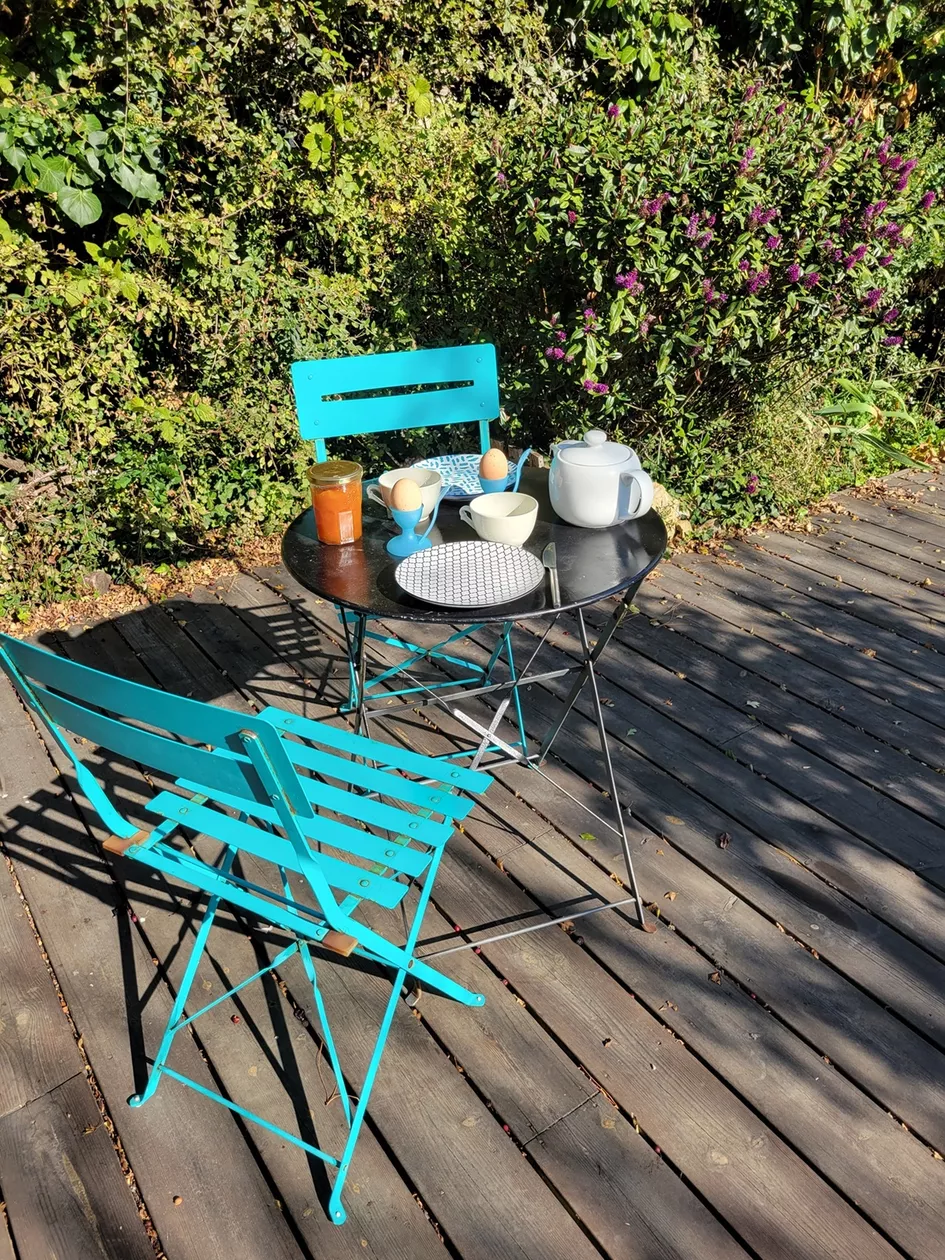 In de tuin : een tafeltje met 2 stoelen en parasol, 2 ligstoelen.