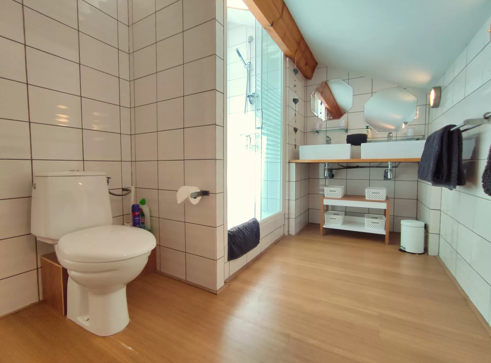 Het vakantiehuis bestaat uit een grote open woonkamer, vier slaapkamers (met een tweepersoonsbed of twee eenpersoonsbedden), een kinderkamer die verbonden is met een van de tweepersoonskamers (met een eenpersoonsbed en een kinderbedje of twee kinderbedjes). Er zijn twee badkamers, beide met een douche, toilet en wastafel.