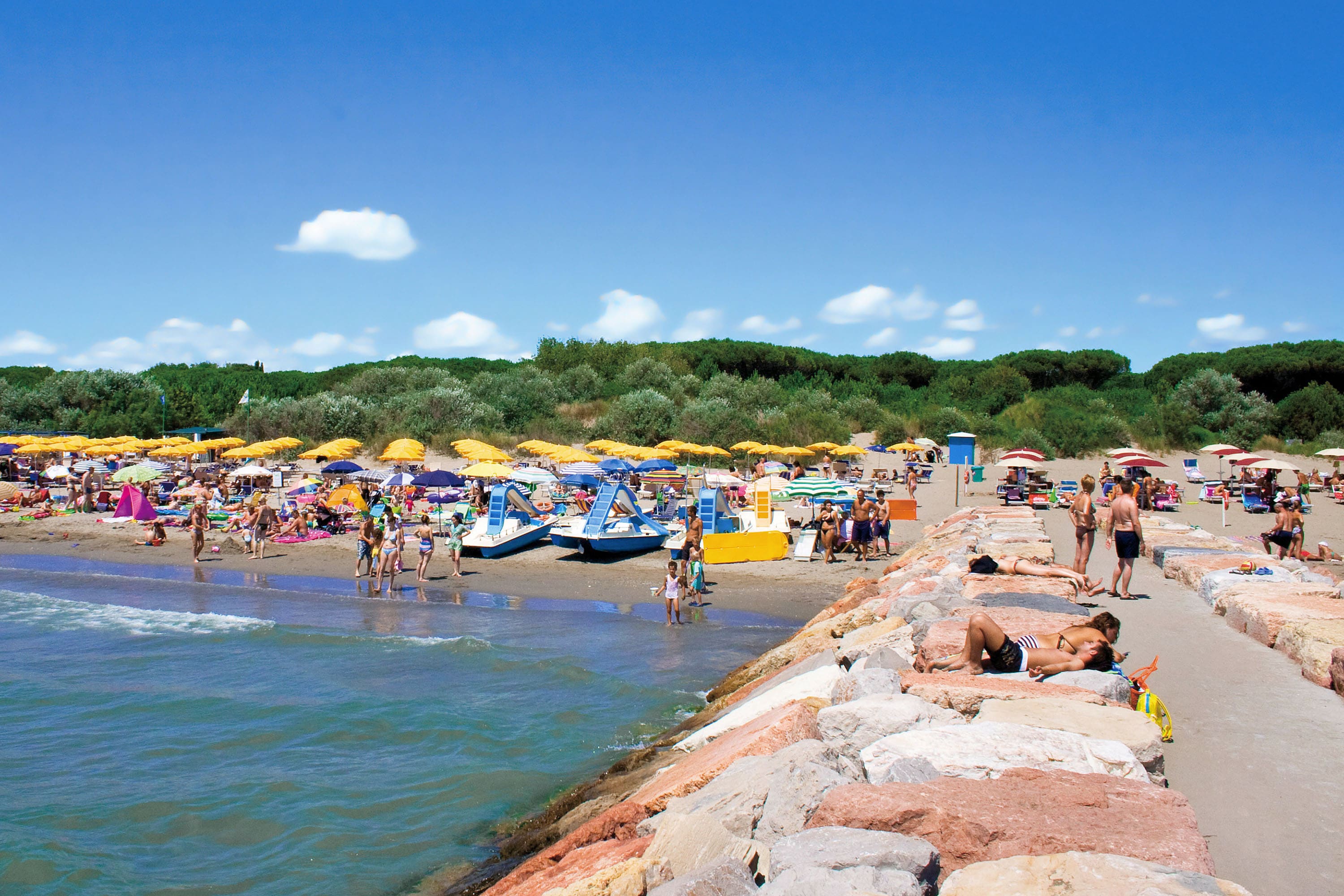 Je blijft vast niet de hele dag op de camping. Een kleine wandeling van een minuut of vijf à tien door het pijnbomenbos en je staat op het privéstrand van de camping aan de Adriatische Zee. Ook hier vind je ligbedden onder gele parasols.