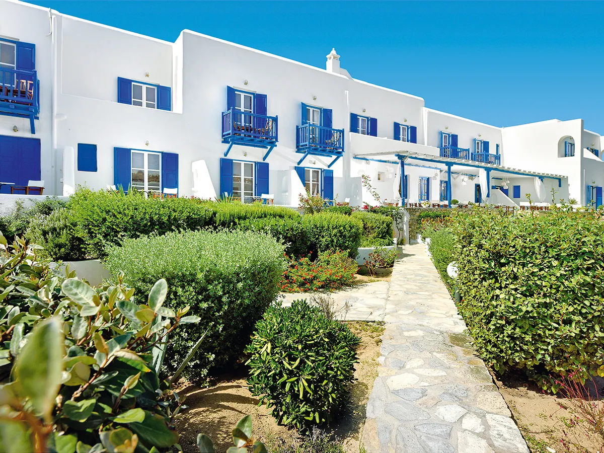 Het hotelcomplex belichaamt de traditionele architectuur van Mykonië en ligt niet ver van het beroemde strand"Ornos".