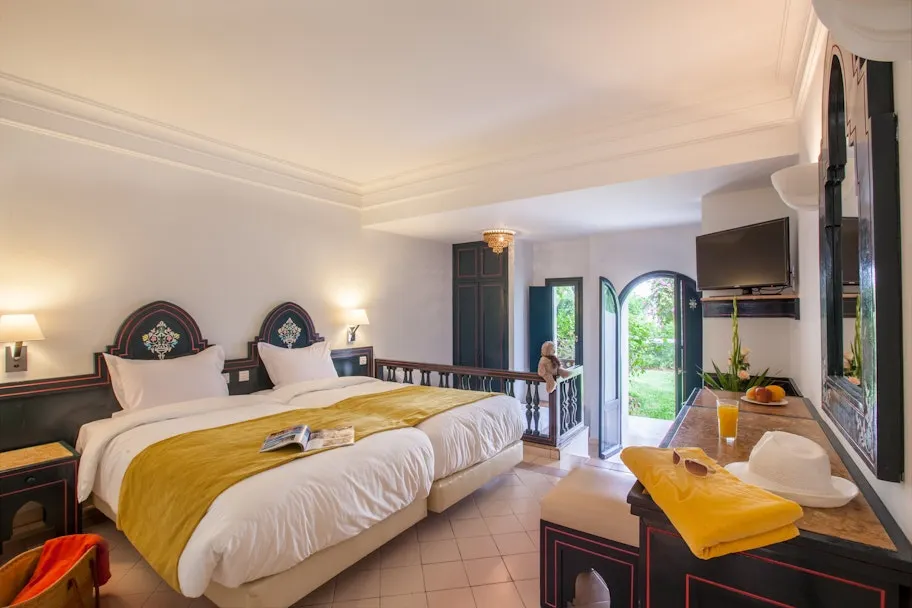 In dit warme, droge deel van het land lijkt dit hotel wel een oase. Hier wuiven de palmbomen je koelte toe en krijgt het gras genoeg te drinken om groen te blijven. Om je heen zie je de stoere muren met mooie poortjes, houtsnijwerk en mozaïek. Dat kan alleen Marokko zijn.