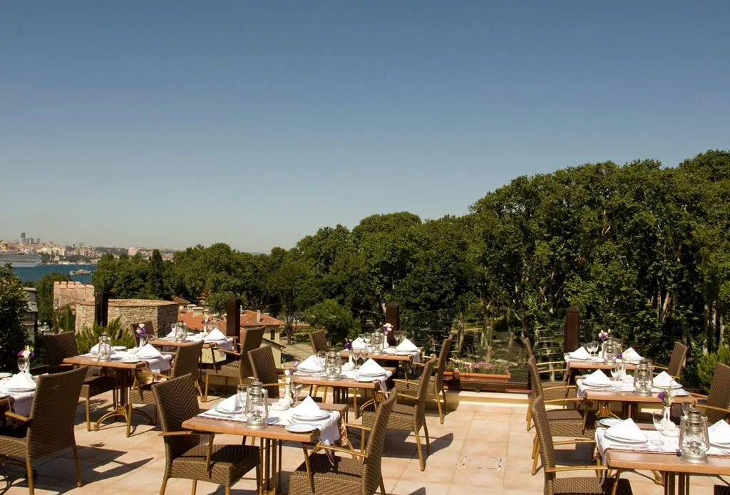 Het restaurant op het dak geeft een verbluffend uitzicht op de tuinen van het Topkapıpaleis..