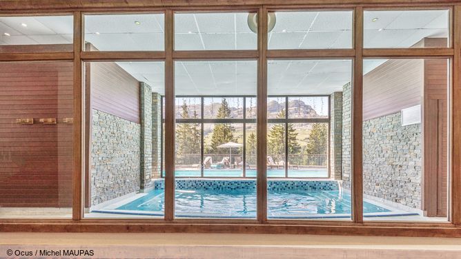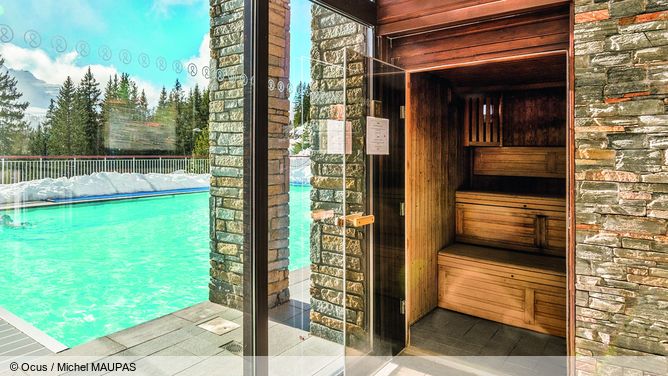 Het wellnessgedeelte met verwarmd buitenzwembad, sauna, hamam en whirlpool met panoramisch uitzicht op de omliggende bergen en fitnessruimte mag je gratis gebruiken..